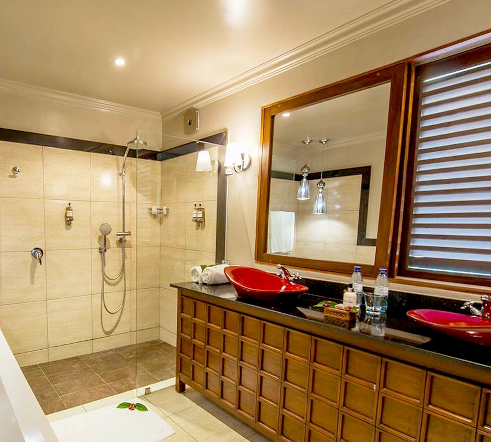 Plantation Suites offer modern comfort with a rainfall shower, bathtub, and a private terrace amidst coffee-themed décor.