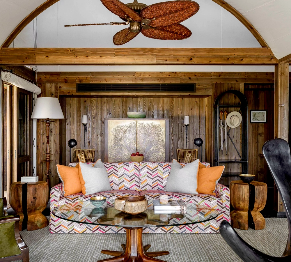 Tented suites feature elegant en-suite bathrooms with both indoor and outdoor showers.