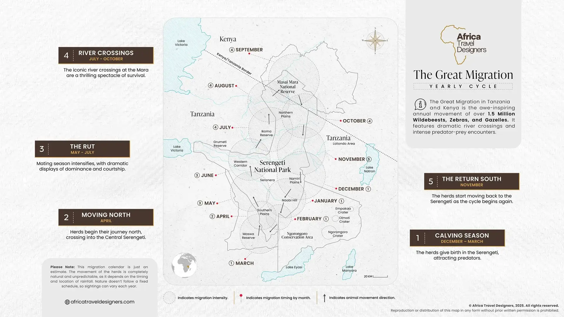 The Great Migration is a year-round journey across Tanzania and Kenya. For the iconic river crossings, the best time is mid-July to October in the Northern Serengeti and Masai Mara.